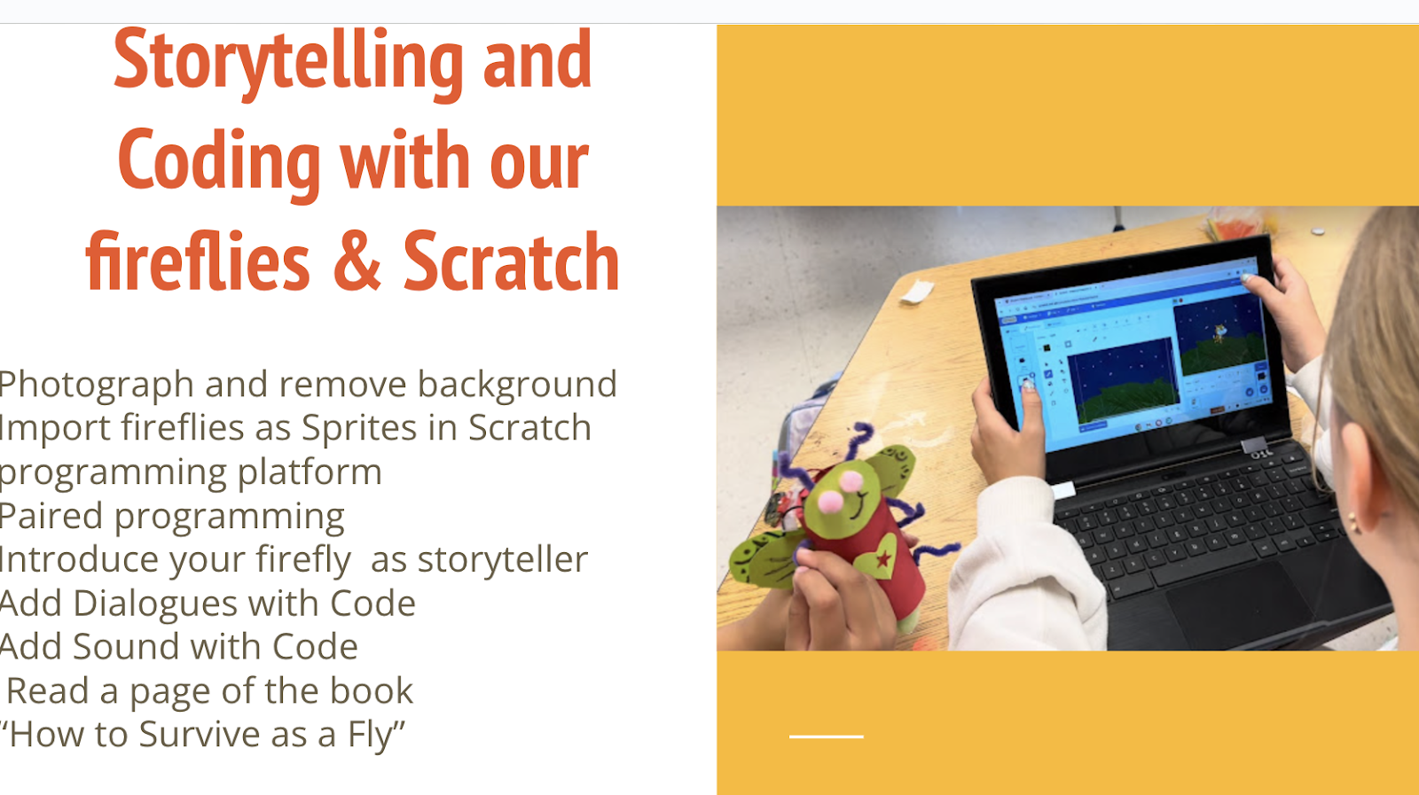 In no time at all, the girls coded a backdrop with blinking fireflies and learned how to animate firefly sprites that could tell stories as they moved across the screen.
