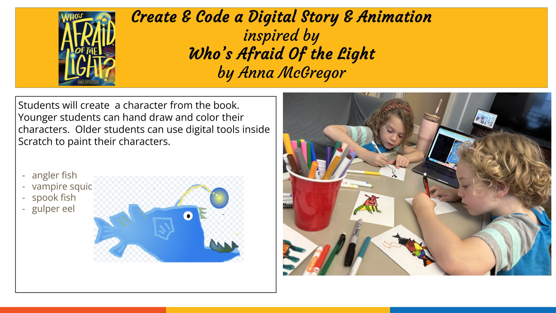 In my recent posts, I introduced a #WAOTL series where you and your students experience computer science by using Scratch to create and code an interactive experience with bioluminescent characters from the children's book "Whose Afraid of the Light" by Anna McGregor.
